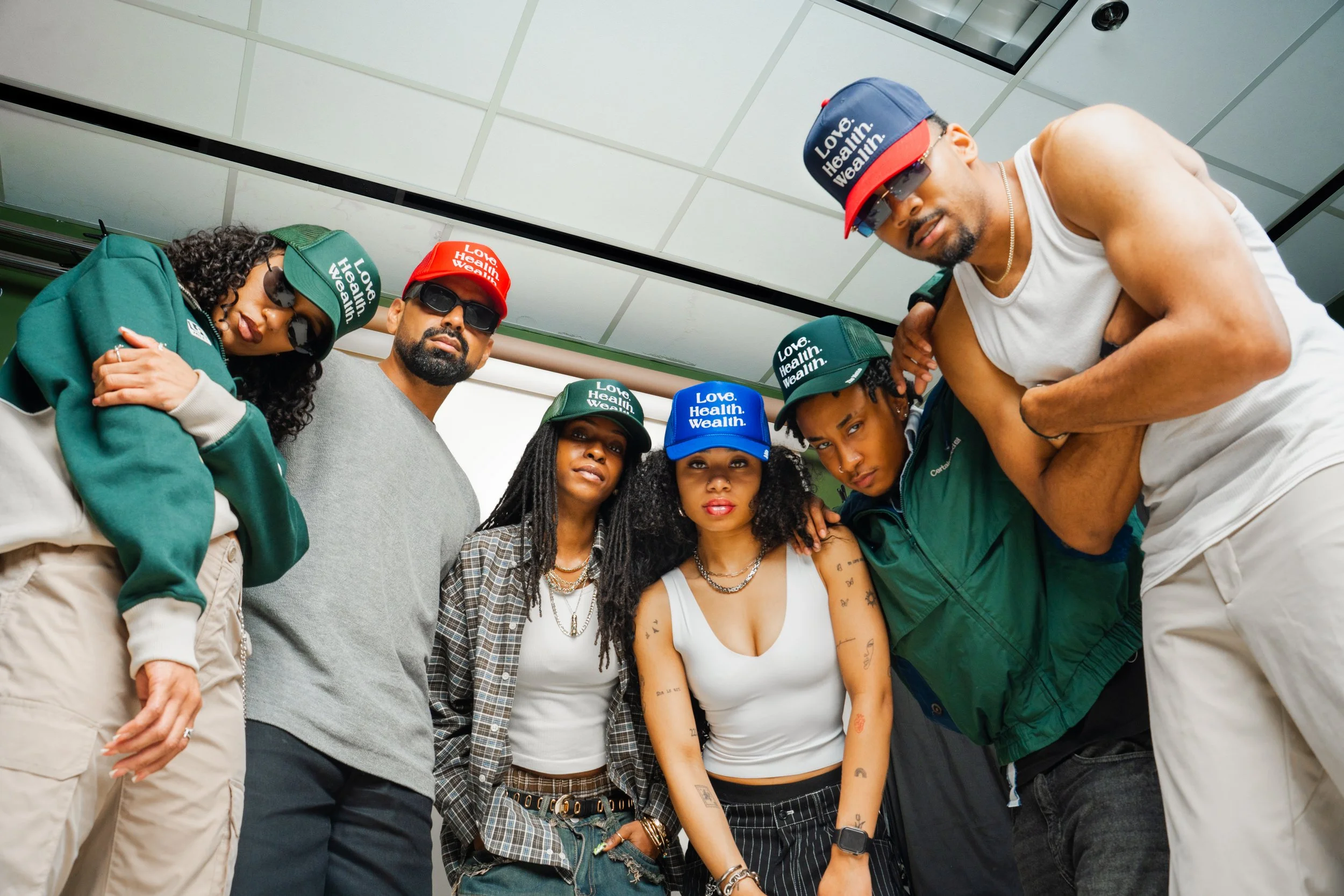 Unisex trucker hat featuring the ‘Love. Health. Wealth.’ motto. Designed for experienced everyday wear with a focus on comfort and self-expression.